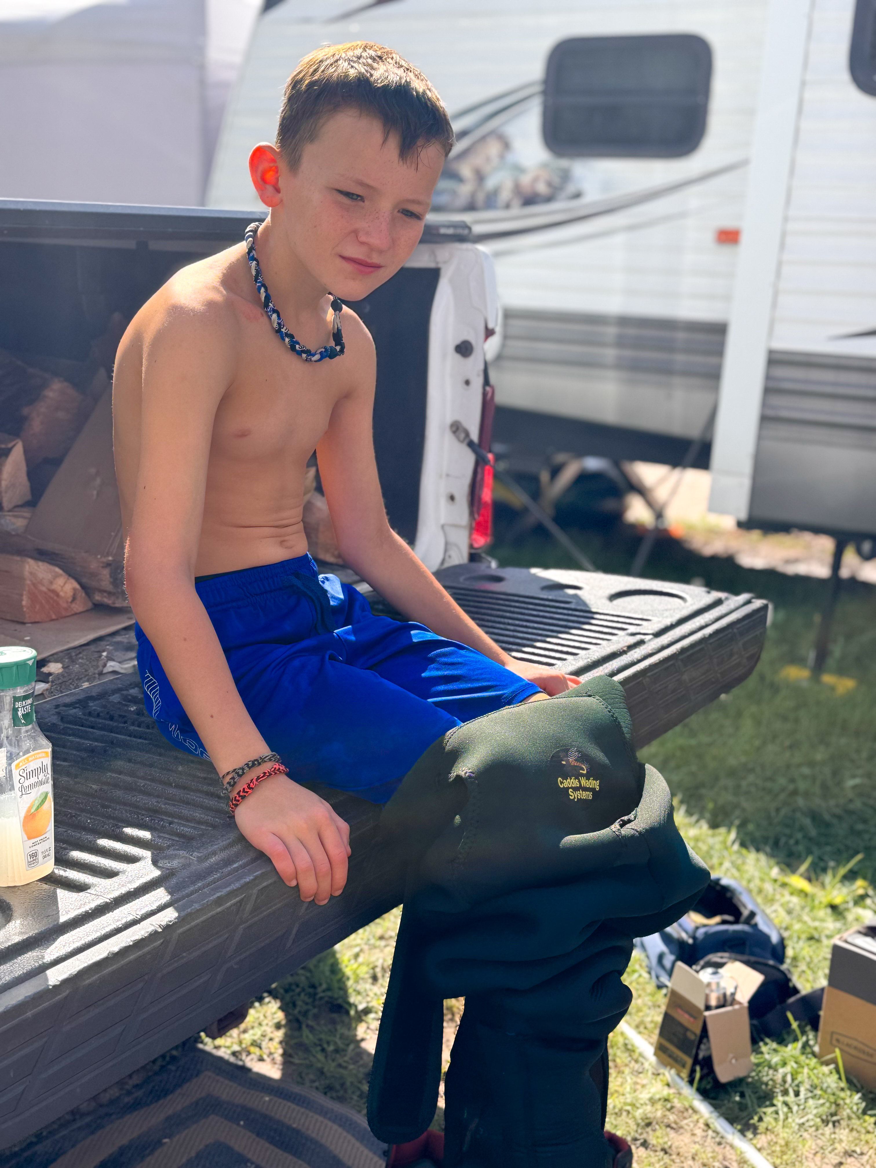 With a bunch of helpful advice being shouted from the shore, I managed to tire him out and get him in the net. Definitely not solo though… shoutout to our camper neighbor Nick for the assist! He’d just caught his first fish too, so it was a solid little celebration.